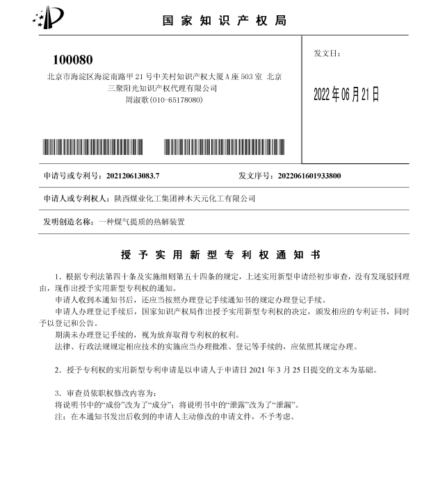 近日,神木煤化工天元公司申請的“一種煤氣提質的熱解裝置”實用新型專利獲得國家知識產權局授權。該專利技術有效解決了塊煤熱解產生的煤氣組份差、氫氣含量低的技術問題。