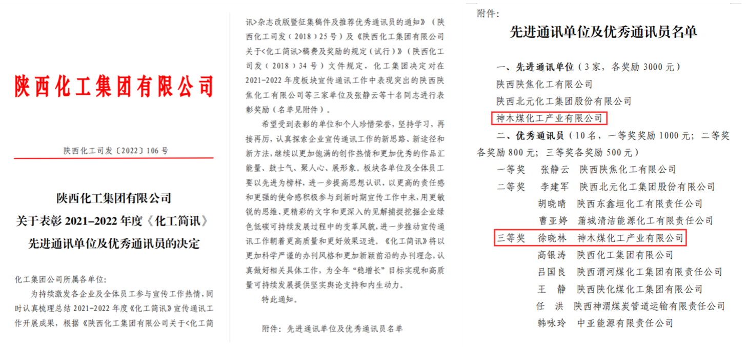 神木煤化工公司榮獲化工集團“2021—2022年度《化工簡訊》先進通訊單位”稱號