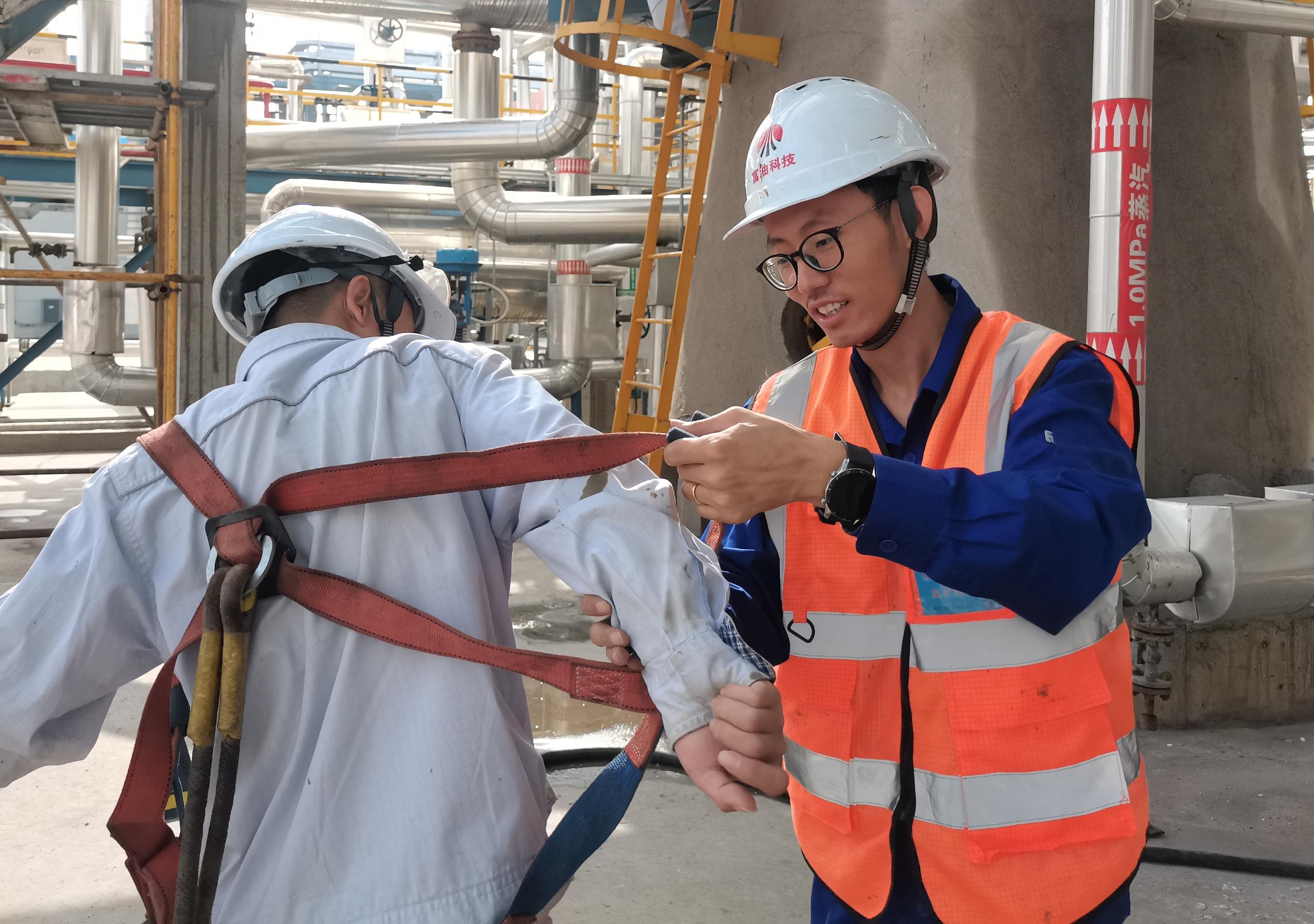 “師傅,這個(gè)全身式安全帶我?guī)湍愦┐骱茫日{(diào)整好安全帶的高低,防止太高,緊急情況下收緊勒到你脖子,對你的身體造成傷害,太低了無法限制身體向前沖,滑出肩膀就十分危險(xiǎn)了,留兩根手指的空隙比較合適,才能有效保障你的高處作業(yè)安全”,F(xiàn)TH中心班長張啟龍一邊說著一邊幫助檢修人員規(guī)范地系上了安全帶。