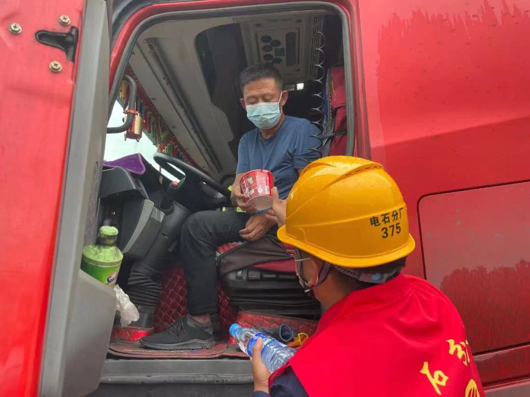 8月23日下午,神木煤化工電化公司志愿者們?yōu)檩斆和ǖ罍舻乃緳C(jī)師傅們送去溫暖。一杯杯熱氣騰騰的開水,一桶桶熱乎乎的泡面,一句句暖心的話語,解決了滯留司機(jī)的燃眉之急,還溫暖了他們的心。(杜仙 張茹)