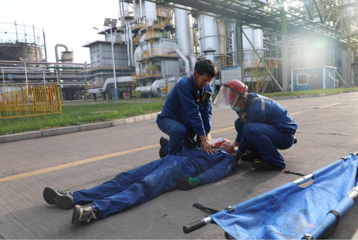 “報(bào)告,現(xiàn)場聽到有毒氣體檢測探頭報(bào)警,一名外來施工人員倒地,請(qǐng)求支援!”“報(bào)告調(diào)度室,制氫車間硫回收裝置發(fā)生氨氣泄漏事故,請(qǐng)調(diào)度室通知上下游車間做好相應(yīng)防護(hù)和人員疏散準(zhǔn)備!”“報(bào)告,加氫車間應(yīng)急隊(duì)員4名,防化服2套,霧化消防水槍頭1個(gè),移動(dòng)消防水炮1臺(tái),消防水帶4盤,前來救援,請(qǐng)指示!”……隨著一聲聲匯報(bào),演練在緊張有序地開展。保衛(wèi)警戒組、應(yīng)急保障組、應(yīng)急處置組、通訊聯(lián)絡(luò)組、物資供應(yīng)組、事故調(diào)查組、生產(chǎn)保障組、現(xiàn)場監(jiān)測組等應(yīng)急小組按照應(yīng)急預(yù)案快速響應(yīng),有序進(jìn)行相應(yīng)的救援工作,各小組聽從指揮、統(tǒng)一行動(dòng)、緊密配合,確保了本次突發(fā)事件的及時(shí)處置。最終,經(jīng)過大家的共同努力,圓滿完成了此次演練任務(wù)。