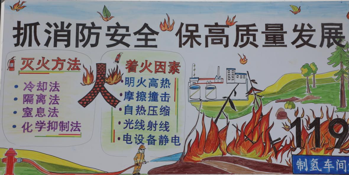 活動現場,消防保衛部對10個車間和質量監督部提前繪制的消防安全板報進行了集中展示。參展板報緊緊圍繞“抓消防安全 保高質量發展”主題,圖文并茂、內容充實,版面設計合理、新穎,吸引了眾多過往職工的駐足觀看,讓大家對消防安全有了更深的理解。最終,經過評比,檢修車間獲得第一名,公用車間獲得第二名,制氫車間獲得第三名。