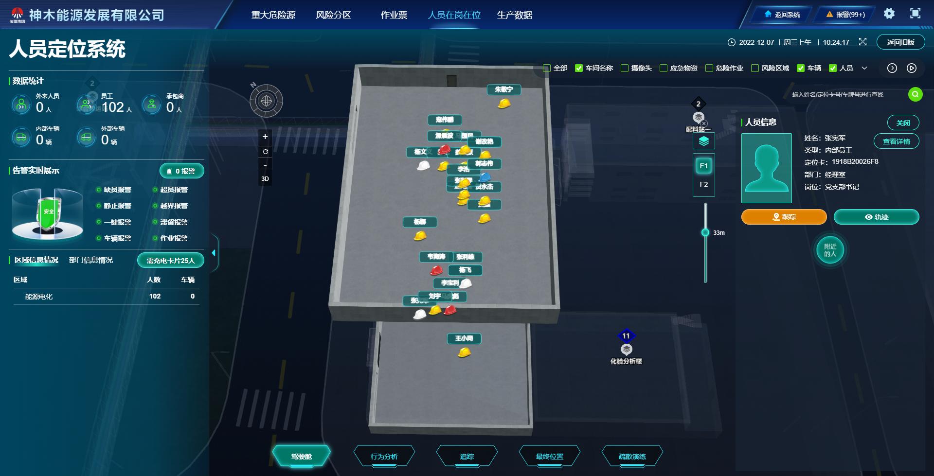 12月7日,神木煤化工能源公司人員在崗在位管理系統(tǒng)正式投入使用。該系統(tǒng)主要包括區(qū)域人數(shù)車輛統(tǒng)計(jì)、人員實(shí)時(shí)定位、人員歷史軌跡回放、缺員報(bào)警、超員報(bào)警、靜止報(bào)警、越界報(bào)警、一鍵報(bào)警、滯留報(bào)警、車輛報(bào)警、作業(yè)報(bào)警、低電報(bào)警、數(shù)據(jù)可視化展示、數(shù)據(jù)接口等功能。