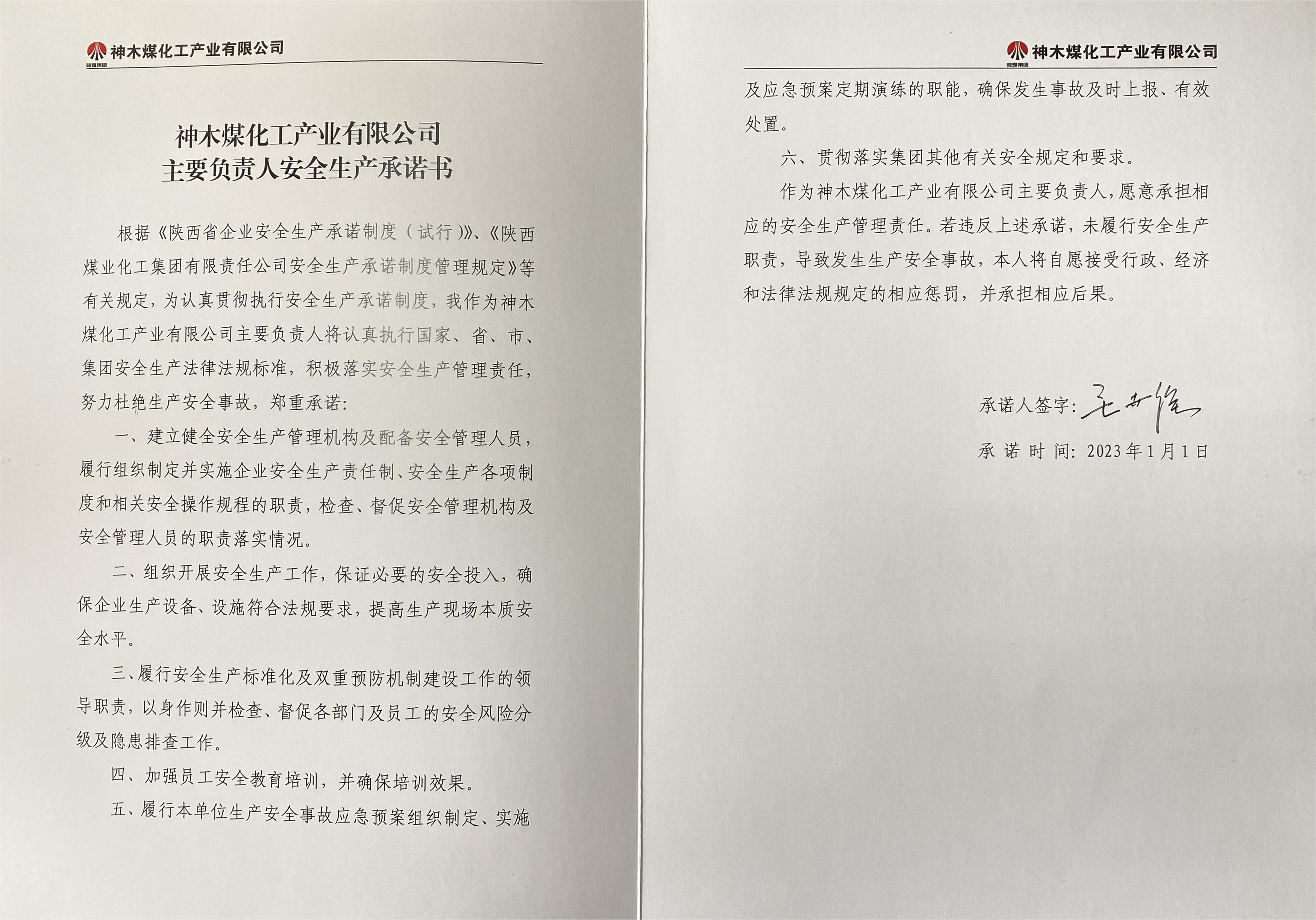 神木煤化工產業有限公司2023年度主要負責人安全生產承諾書公示