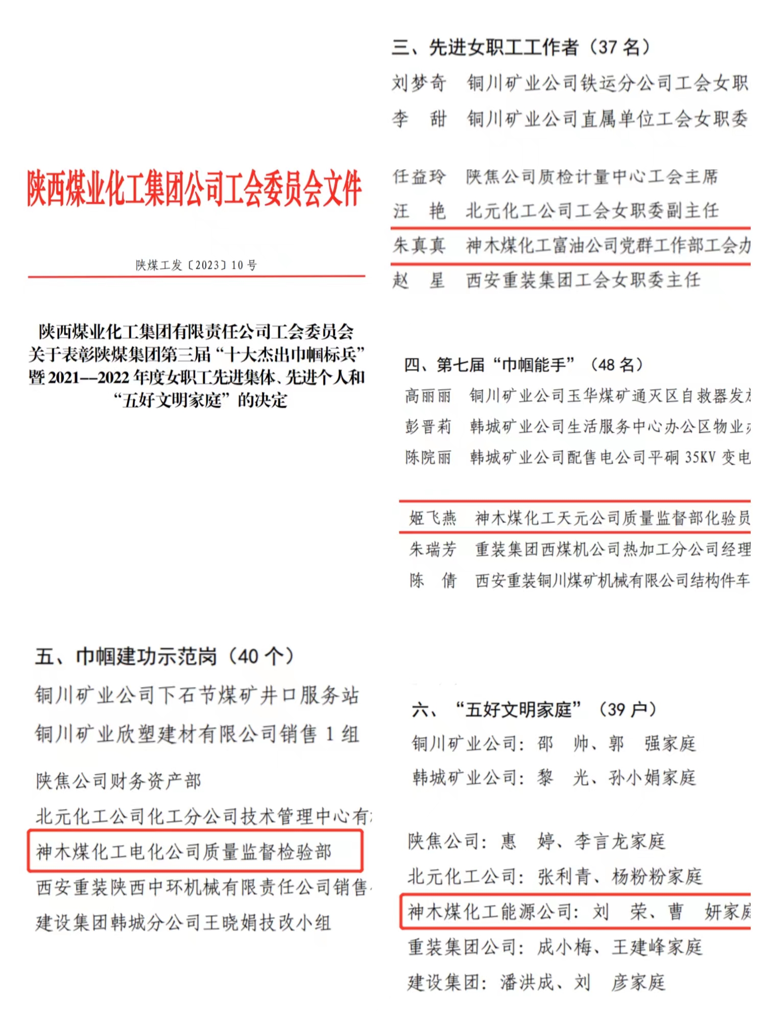據(jù)悉,此次榮獲表彰的先進集體和個人是神木煤化工公司廣大女職工中的優(yōu)秀代表,她們團結(jié)奮進,愛崗敬業(yè),無私奉獻,注重家風家教,敬老愛親,為廣大職工樹立了“她”的榜樣,展現(xiàn)了新時代神木煤化女職工風采。(薛彪)