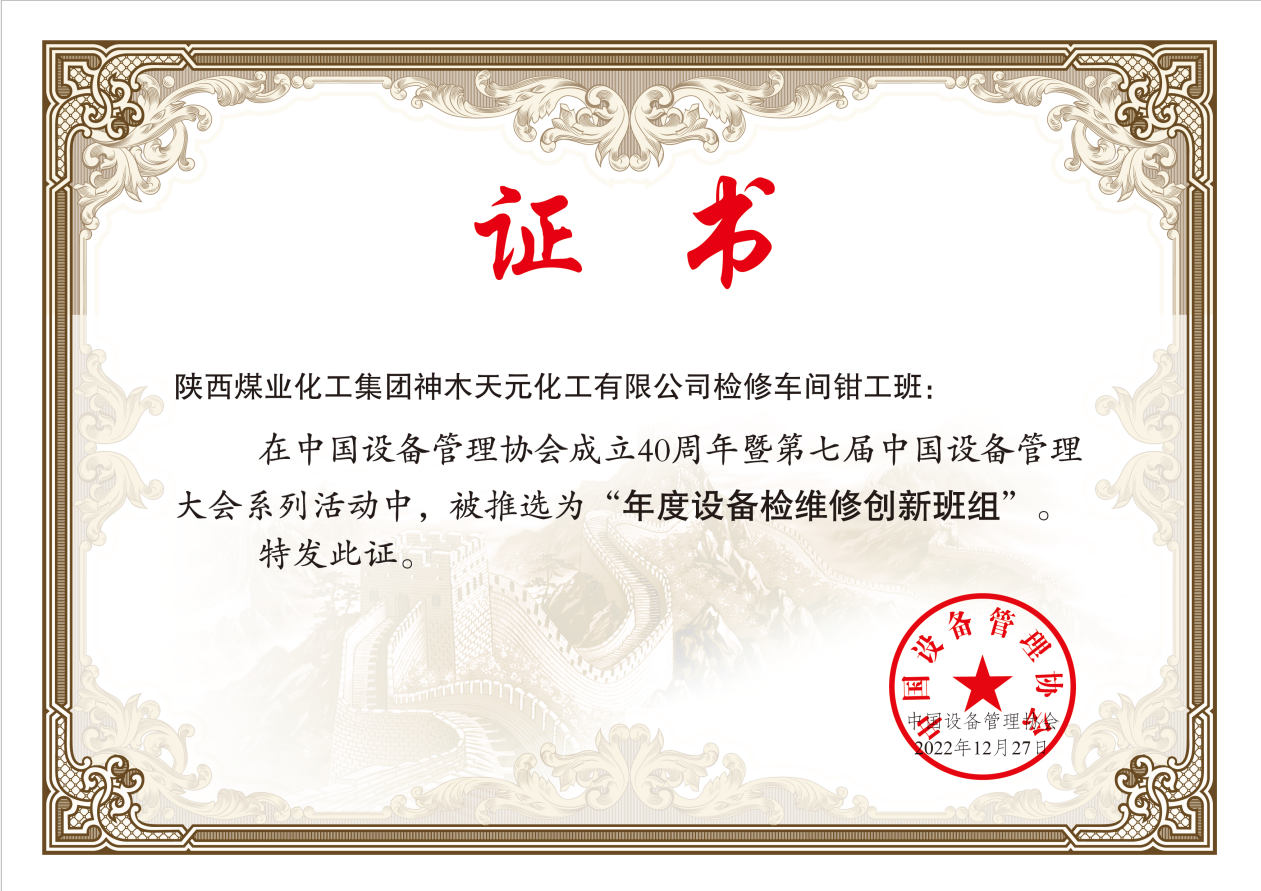 檢修車間鉗工班是神木煤化工天元公司最早組建的機(jī)械專業(yè)班組,多次榮獲天元公司先進(jìn)班組、安全生產(chǎn)先進(jìn)班組等,并在中國設(shè)備管理協(xié)會成立40周年暨第七屆中國設(shè)備管理大會系列活動中,被推選為“2022年度設(shè)備檢維修創(chuàng)新班組”。