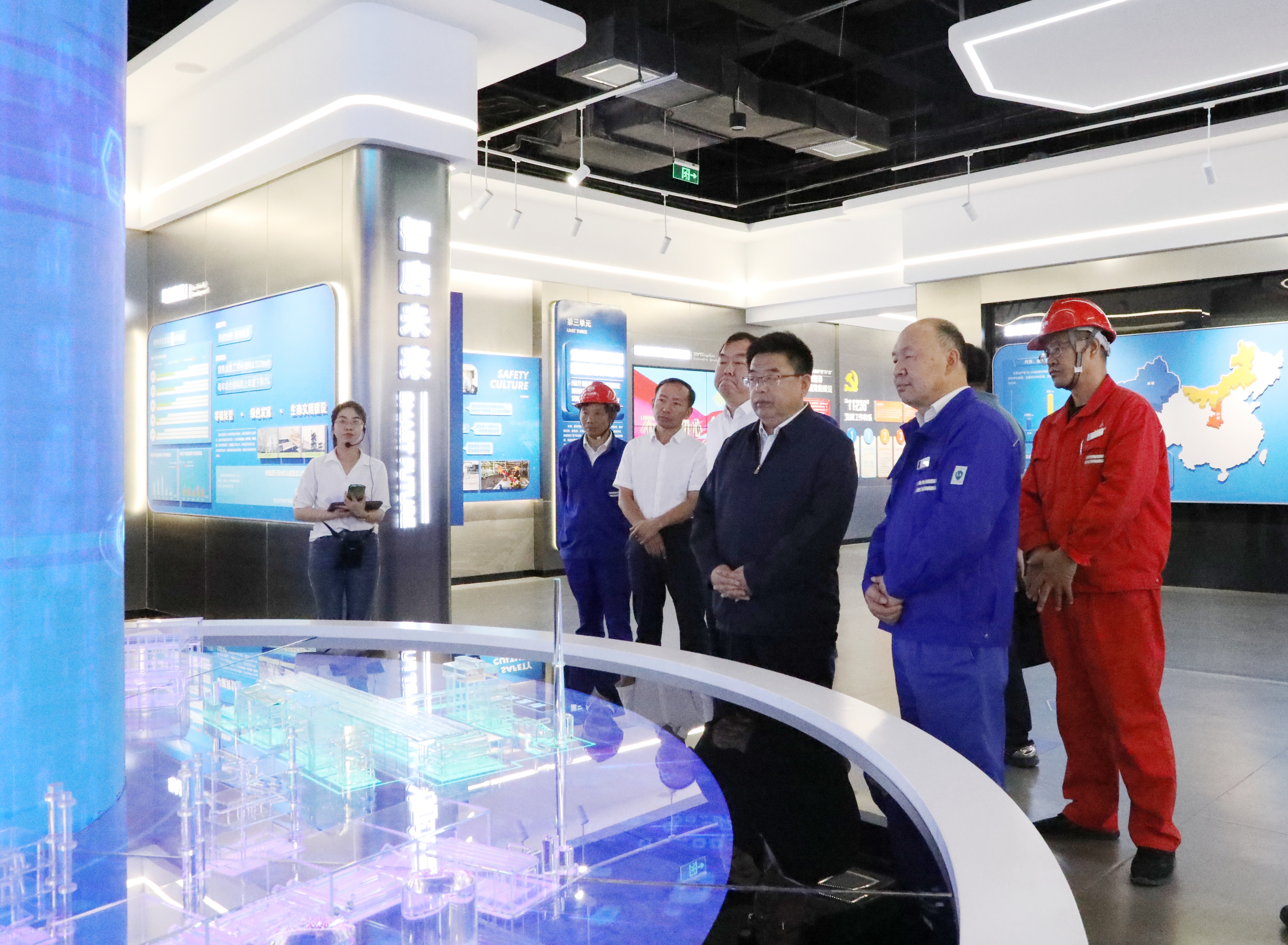 段智博一行先后來到富油公司中控大廳和文化展廳,通過實地查看、交流詢問等方式,了解工藝流程、裝置運行、主要產品、經濟效益、原料供給、產品下游市場應用等情況。在聽取富油公司副董事長楊占標關于企業的業務現狀、生產經營及發展規劃等情況介紹后,段智博認為該公司采用自主知識產權的煤焦油全餾分加氫制環烷基油技術生產高附加值油品對于做大、做強、做長煤焦油深加工產業鏈的戰略意義前景廣闊、競爭優勢顯著,并就當前消費稅足額征收給企業發展帶來的巨大壓力和困擾進行了交流。