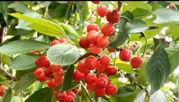 “其實,小櫻桃品種比大櫻桃好吃,到市場上,吃慣了老櫻桃的人專找它,以前南橋礦有個老人就在賣,但是聽說他已不在了……”父親眼睛里夾雜著一絲憂傷。“現在的人光圖好看,殊不知大櫻桃根本比不上它,可是小櫻桃成熟的時間太集中,皮薄難摘,沒辦法,去年我下決心把大多數的老櫻桃樹嫁接了,你看嫁接的都活了”父親說著又將我帶到了嫁接的樹前,“這些都是我從楊凌買的樹上采的好樹蔫子(接穗)”,父親指著他的勞動成果喜悅之情溢于言表。俗話說“櫻桃好吃樹難栽”。是啊,父親為了這些櫻桃樹可謂費了不少周折。那些老櫻桃樹苗是父親專程從幾百里之外的故鄉移栽過來的,他像護理嬰幼兒般守護著它,松土,施肥,澆水,修剪……最后成長為一棵棵郁郁蔥蔥的大樹,樹上的果子皮太薄、汁太多,嬌嫩得不敢碰觸,慢慢采下來輕放在器具中。看到樹上那紅紅的小櫻桃,我仿佛看見父親用小小的籠挎著,尋一個街頭坐著,一斤只要幾塊錢,拿現在的物價來說,真的是不夠費力氣。我突然覺得,他采摘的不是單純的利益,而是對于時光的緬懷和對于故鄉物產的一種情懷。隨后父親為適應市場需求,又再次將小櫻桃樹換頭嫁接成大櫻桃樹,為了好品種,雖已進入花甲之年的父親,卻仍孤身奔赴楊凌購買優良品種樹苗,從山東煙臺網購大櫻桃樹苗……一分耕耘,一分收獲,那些樹苗在父親的呵護下茁壯成長。終于大櫻桃樹也掛果了,與小櫻桃相比,大櫻桃品種個大,紅若瑪瑙、燦如寶石,飽滿鼓脹、圓潤油滑,有通紅的、有黃里帶紅、有紅得發紫發黑的……皮厚肉多,便于儲存托運。小丸子般大小,果肉酥軟柔嫩,清爽可口,咬起來,一口一個,卻也嘎吱作響,津液泉涌,吃起來也過癮。每年櫻桃成熟季,櫻桃紅也深深吸引了鳥兒,成群的鳥在樹的周圍嘰嘰喳喳,好似呼朋喚友在櫻樹周圍飛來飛去瞅準時機美餐一頓,于是展開了一場人與鳥爭食櫻桃的搶奪戰。父親想了很多種辦法,用草帽和舊衣服制作假人,購買閃閃發亮的彩帶,從農藥店購買回驅鳥劑……但總趕不走鳥,這不今年又從網上購買回許多發出怪聲的驅鳥器,真沒想到,這個辦法還挺奏效,父親高興地說:今年鳥不來了……如今一年四季都有櫻桃,各地超市都能買到它。但是無論走多遠,我都會關注著家里櫻桃的成熟之期。花一落地,就會打聽家里櫻桃熟了沒?因為櫻桃成熟時節就是游子的歸期,吃櫻桃必須是家里櫻桃,“大櫻桃就要快全紅了,那品種耐儲運,讓你小妹在廣東好好宣傳下,在網上賣賣,五湖四海的人都能吃上咱們家的櫻桃……”父親邊走邊給我講述著他的夢想,聽著父親的話,看著那綠蔥蔥的櫻桃樹,嘴里吃著甜櫻桃,我不禁思索了許久,一個年紀七十多歲的老人有如此的雄心壯志,風華正茂的我們又有何不奮斗的理由呢?陣陣微風吹來,綠葉掩映下綴滿枝頭的一顆顆鮮紅欲滴的大紅櫻桃隨風搖曳,此刻,令我終生難忘的不僅是父親的櫻桃那份甜蜜,更是因為它里面蘊藏著父親那銳意進取,奮斗不息的精神!