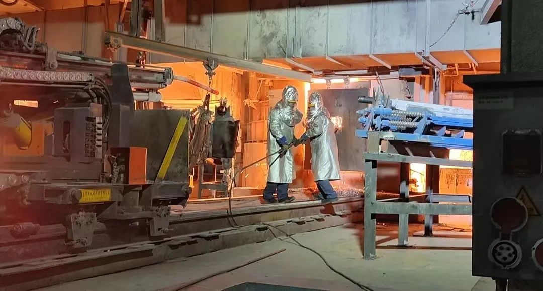在生產一線,員工們冒著高溫酷暑在各個作業面執行工作,尤其是負責電石出爐的工人們,即使在炎熱的夏天,出爐工們依然要穿著防燙服在烈日下工作,冷卻車間里又熱又烤,汗水也早已浸透了他們的衣服。
