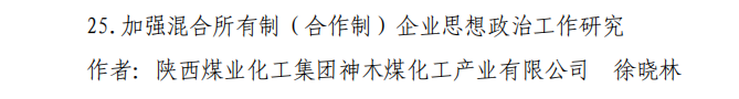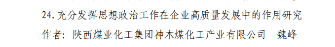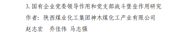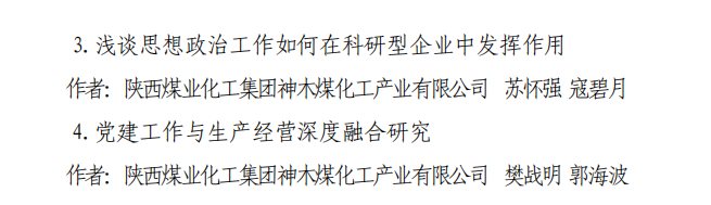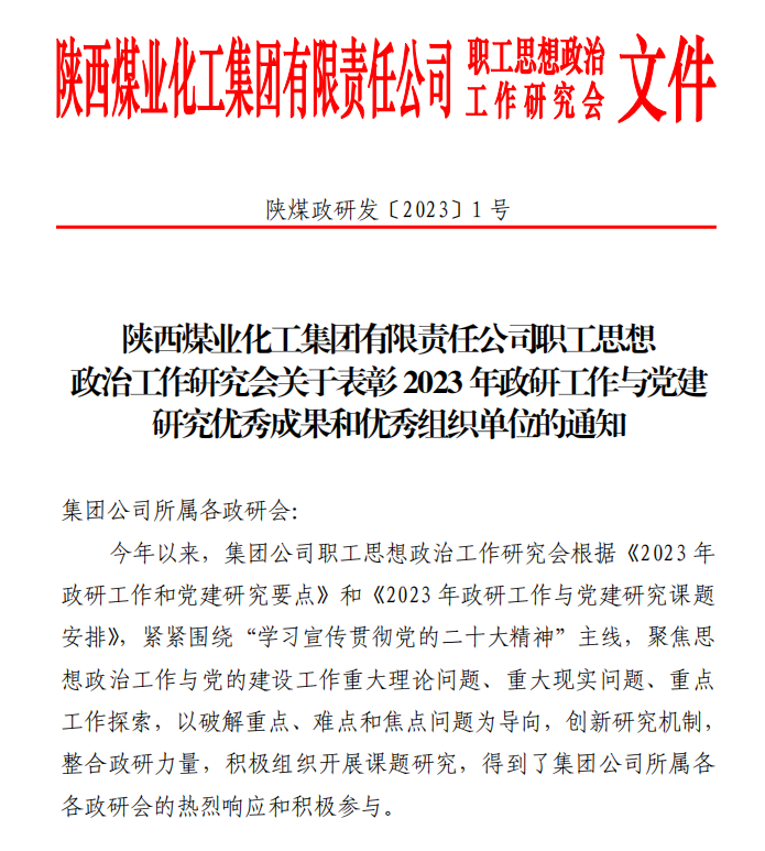 近日,陜煤集團(tuán)下發(fā)了《關(guān)于表彰2023年政研工作與黨建研究?jī)?yōu)秀成果和優(yōu)秀組織單位的通知》,公布了2023年政研工作與黨建研究?jī)?yōu)秀成果及優(yōu)秀組織單位名單,神木煤化工公司榮獲三個(gè)三等獎(jiǎng)和五個(gè)優(yōu)秀獎(jiǎng)。