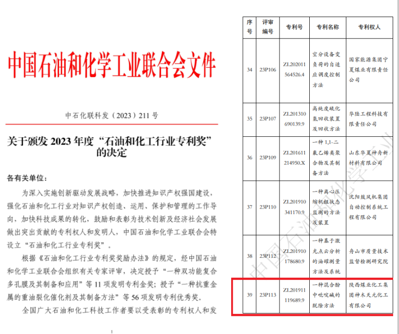 近日,中國石油和化學(xué)工業(yè)聯(lián)合會公布了2023年度“石油和化工行業(yè)專利獎”名單,神木煤化工天元公司“一種混合酚中吡啶堿的脫除方法”發(fā)明專利榮獲優(yōu)秀獎。