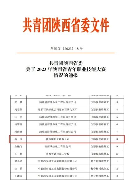 近日,在共青團陜西省委關于2023年陜西省青年職業技術大賽情況通報文件中獲悉,神木煤化工能源公司職工高剛在“儀器儀表維修工決賽”中,砥礪前行,以其精湛的技藝斬獲決賽第8名的佳績。