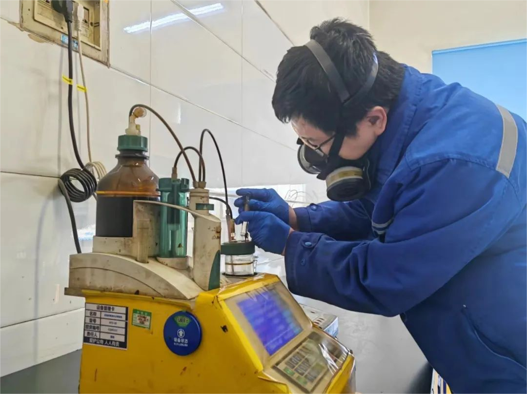 在質量監督部運行一班,景飛國正在進行油品水分分析,只見他細心地對自動水分儀進行標定,將油品混勻,用玻璃注射器取少許樣品放在天平室,利用差減法,獲取樣品質量,待儀器達到平衡后,按參數設定輸入樣品質量,讀取分析結果,并仔細核對數據。他說:“在崗一分鐘,盡職六十秒。化驗分析是安全生產的眼睛,要堅持用數據說話,安全操作、精心分析,切實把好產品質量關”。據了解,截至自2月12日,節日期間質量監督部共計分析樣品60余個,完成油品、氣體、水質分析300余項。