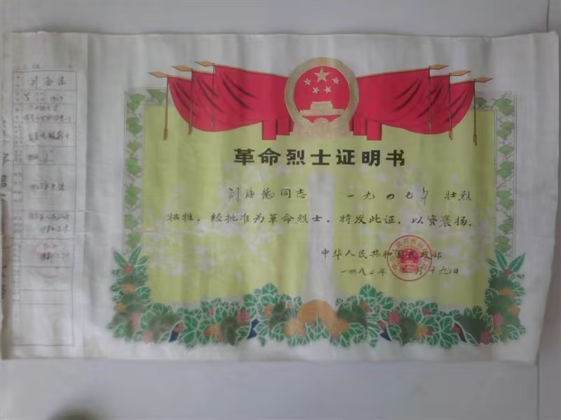 屈指算來,外曾祖父犧牲已七十七年,雖然我們留存的親人從沒有見過他,但從這張泛黃的證明書上,我仿佛看到了外曾祖父傳奇而光榮的一生。他的人生短暫宛如流星,但他在有限的生命里卻是波瀾壯闊的一生,讓我心生敬仰。