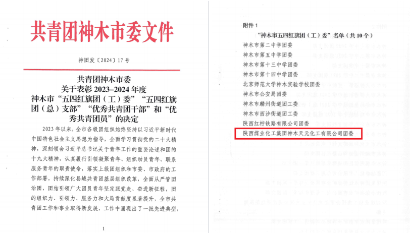 近日,共青團神木市委下發(fā)了《關于表彰2023-2024年度神木市“五四紅旗團(工)委”“五四紅旗團(總)支部”“優(yōu)秀共青團干部”和“優(yōu)秀共青團員”的決定》,神木煤化工天元公司團委榮獲2023-2024年度神木市“五四紅旗團委”榮譽稱號。