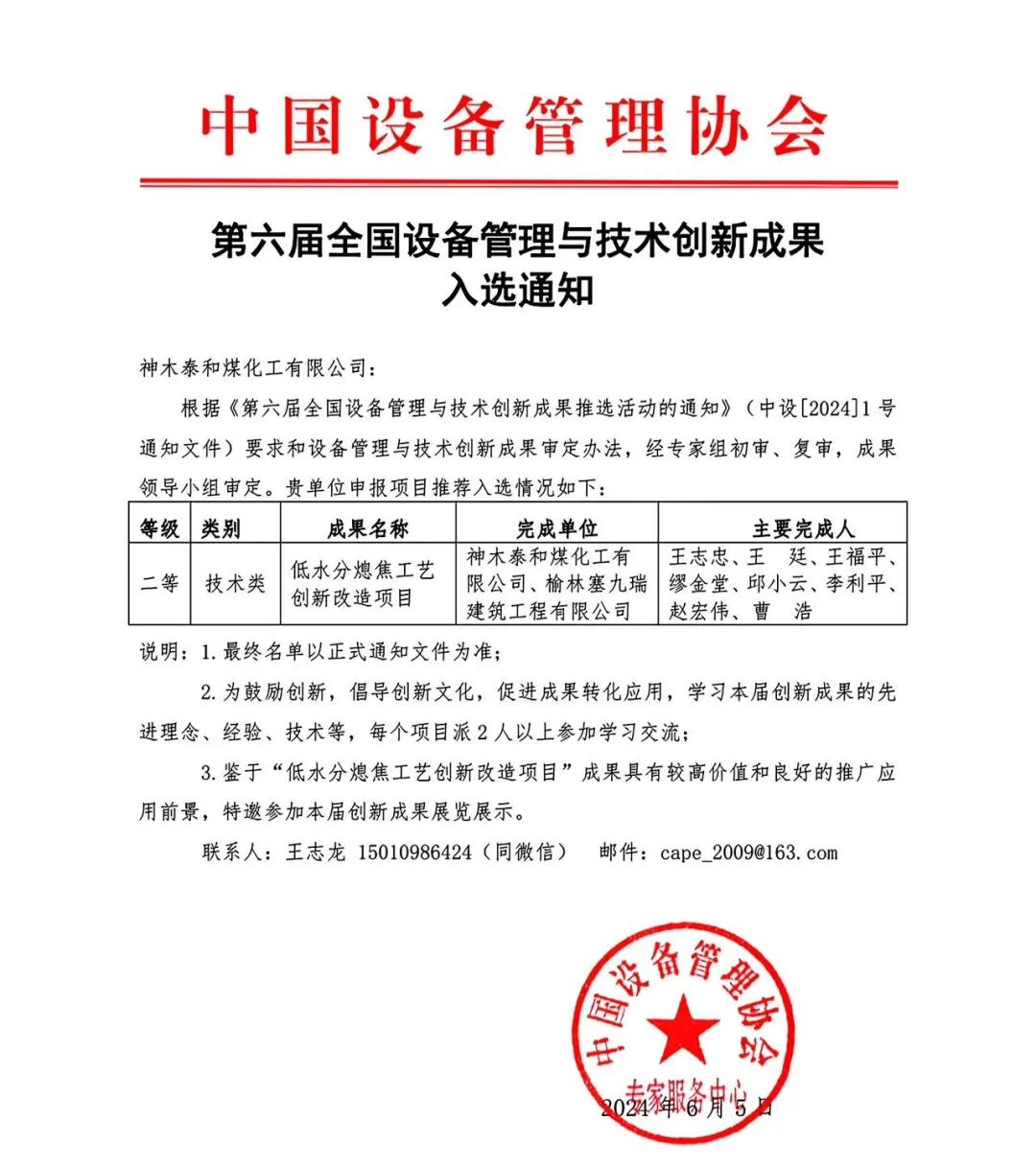近日,從中國設備管理協(xié)會相關文件獲悉,神木煤化工泰和公司“低水分熄焦工藝創(chuàng)新改造項目”獲第六屆全國設備管理與技術創(chuàng)新成果二等獎。