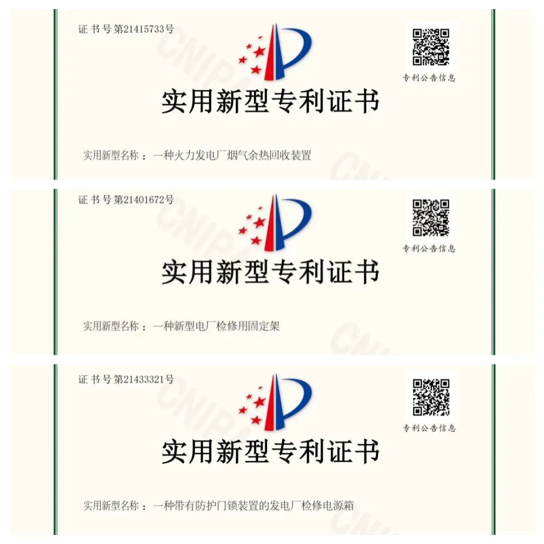 近日,電化公司申請的“一種帶有防護門鎖裝置的發電廠檢修電源箱”“一種新型電廠檢修用固定架”“一種火力發電廠煙氣余熱回收裝置”三項創新成果成功獲得國家知識產權局授權。截至目前,電化公司2024年累計授權專利數已突破10件。