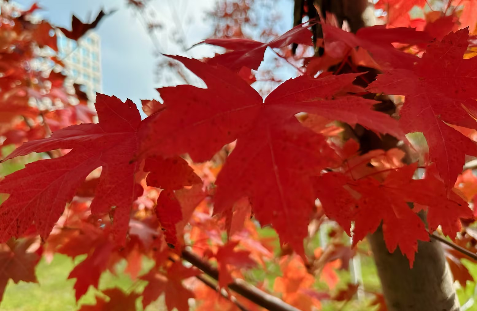 晨光下像火像血的楓葉高高掛在枝頭