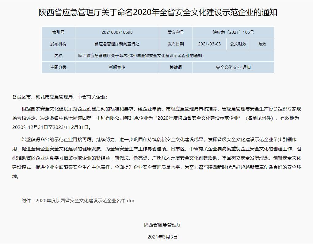 近日,從陜西省應(yīng)急管理廳發(fā)布的《關(guān)于命名2020年全省安全文化建設(shè)示范企業(yè)的通知》陜應(yīng)急〔2021〕105號(hào)文件中獲悉,電化公司順利通過省應(yīng)急管理廳與安全生產(chǎn)協(xié)會(huì)專家現(xiàn)場考評(píng),被評(píng)定為“2020年度陜西省安全文化建設(shè)示范企業(yè)”,有效期為2020年12月31日至2023年12月31日。