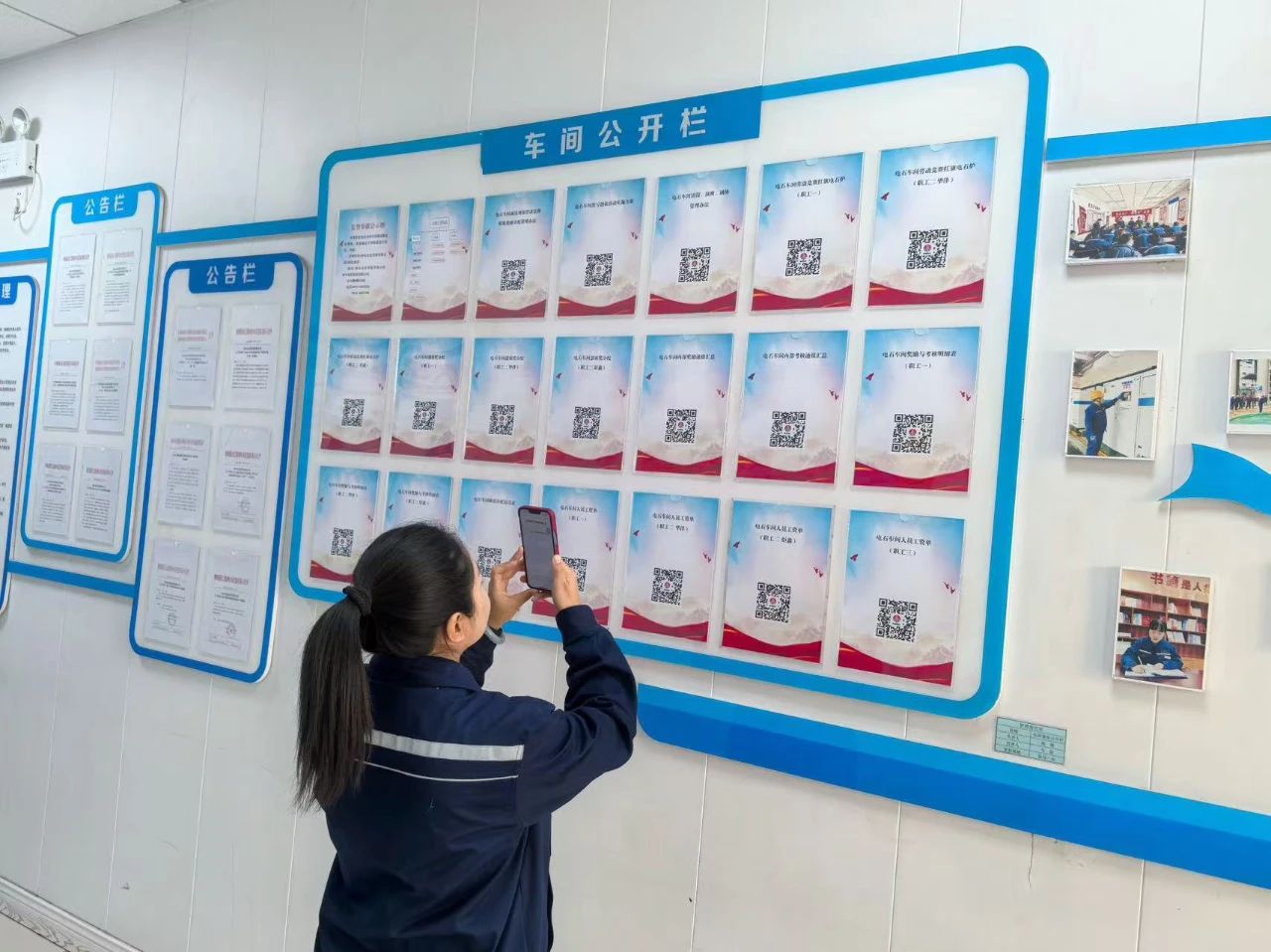 巧用二維碼,無紙促增效。該公司電石車間文化長廊展示的廠務公開欄,一直以來都是以紙質版資料展示,每月更換一次,使用紙張數目多且員工查看不方便。辦公室管理人員通過對標先進,提出創新意見,使用二維碼在線掃碼查看所有廠務資料,管理人員只需要一次性將二維碼展示在看板,每月更新電子版廠務資料,員工們就可以通過手機或企業微信掃一掃功能,多人隨時隨地查看,方便又美觀,實現了無紙化增效的目的。