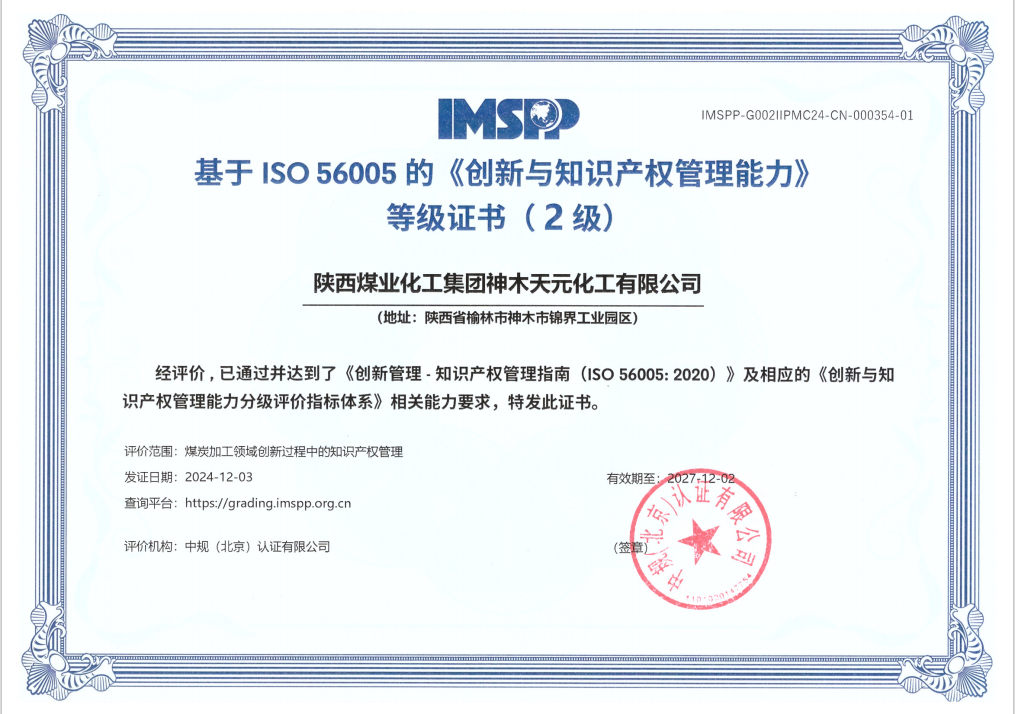 近日,天元公司成功獲得由中規(北京)認證有限公司頒發的ISO 56005《創新與知識產權管理能力(2級)》證書,成為榆林市首家獲評該級別的企業,標志著公司的創新與知識產權管理水平邁上了新臺階。