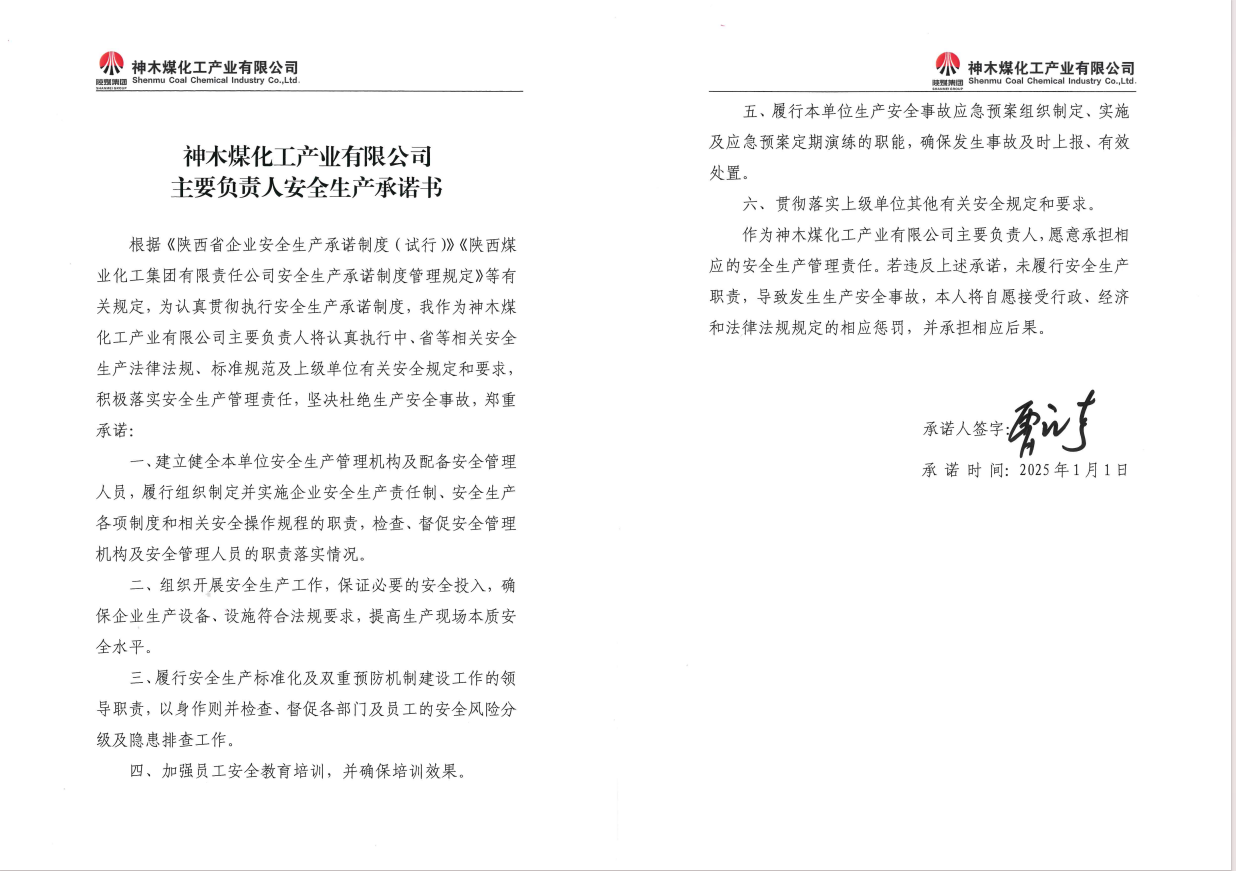 神木煤化工產業有限公司2025年度主要負責人安全生產承諾書