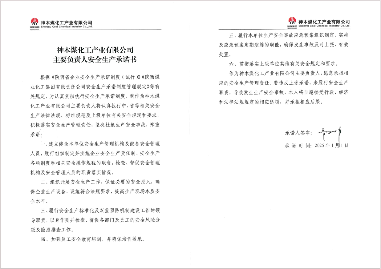 神木煤化工產業有限公司2025年度主要負責人安全生產承諾書