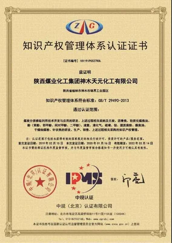 此次認證范圍的調整是天元公司基于產業延伸及工藝技術升級進行的一次針對性調整;也是基于“大型工業化低階粉煤回轉熱解成套技術”達到國際領先水平,12萬噸碳材料項目工業化裝置成功建設、順利投產,知識產權貫標工作穩步推進、踏上新征程進行的一次建設性調整;更是以知識產權助力打造“以煤為基、國內一流的技術型煤炭資源綜合利用的集團化企業”而進行的一次戰略性調整。
