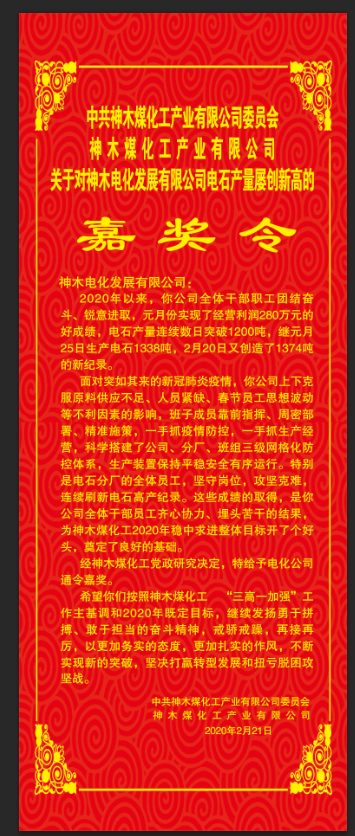 嘉獎令還特別對該公司表現突出的電石分廠全體員工給予了充分肯定,該分廠員工節日期間堅守崗位,克服重重困難,連續作戰,不斷刷新電石高產紀錄,為神木煤化工公司2020年穩中求進整體目標開了個好頭,奠定了良好的基礎。(閔立娟)