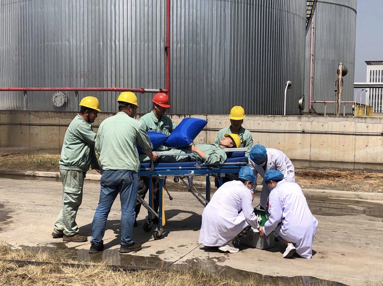 演練模擬6月12日上午10點,該公司制油分廠罐區兩名巡檢工在例行日常巡檢時發現儲油罐T-54206泄漏引起著火事故,其中一名巡檢工煙氣中毒暈倒。該公司緊急啟動生產安全事故應急預案,并將火情向廟溝門人民政府及府谷縣應急管理局報告。該公司消防隊、醫療和后勤保障組、設備搶修組、安全環保組、技術組、環保監測組等專業處置組緊急出動、協同配合,對受傷人員進行有效救援處置,火情完全得到控制并逐漸消除,應急演練圓滿完成。