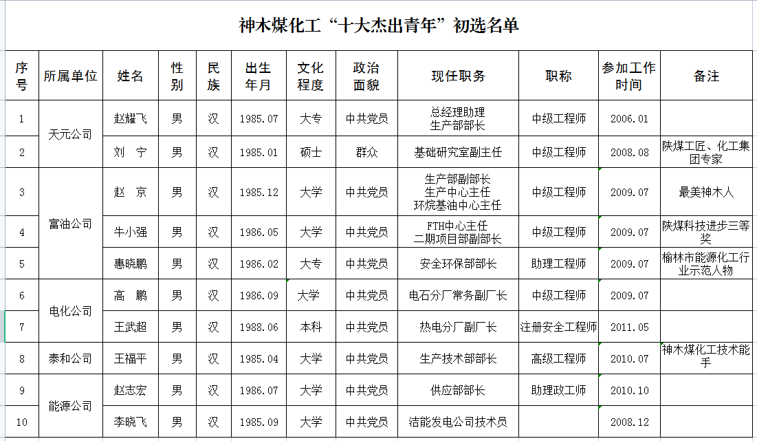 公司“十大杰出青年”評(píng)選活動(dòng)于3月份啟動(dòng)以來(lái),經(jīng)歷人選推報(bào)、資格審查、評(píng)審確定等環(huán)節(jié),在“公平、公正、公開(kāi)”的基礎(chǔ)上產(chǎn)生了“十大杰出青年”。現(xiàn)將評(píng)選結(jié)果予以公示。如對(duì)公示人選持有異議,歡迎廣大干部職工向活動(dòng)組委會(huì)辦公室(黨委工作部)反映情況。具體如下: