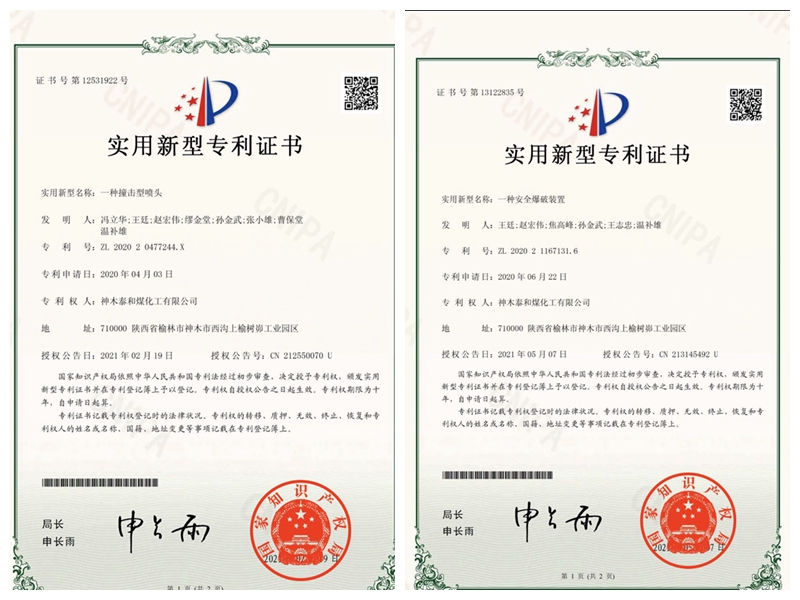 近日,泰和公司接連收到兩份國家知識產(chǎn)權(quán)局下發(fā)的實用新型專利證書,分別是“一種安全爆破裝置”、“一種撞擊型噴頭”兩項實用新型專利。