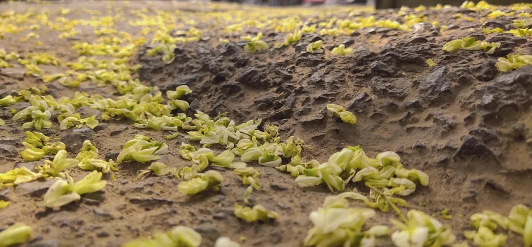 昨朝它見媚多襲,今曦嬌紅殘一地。