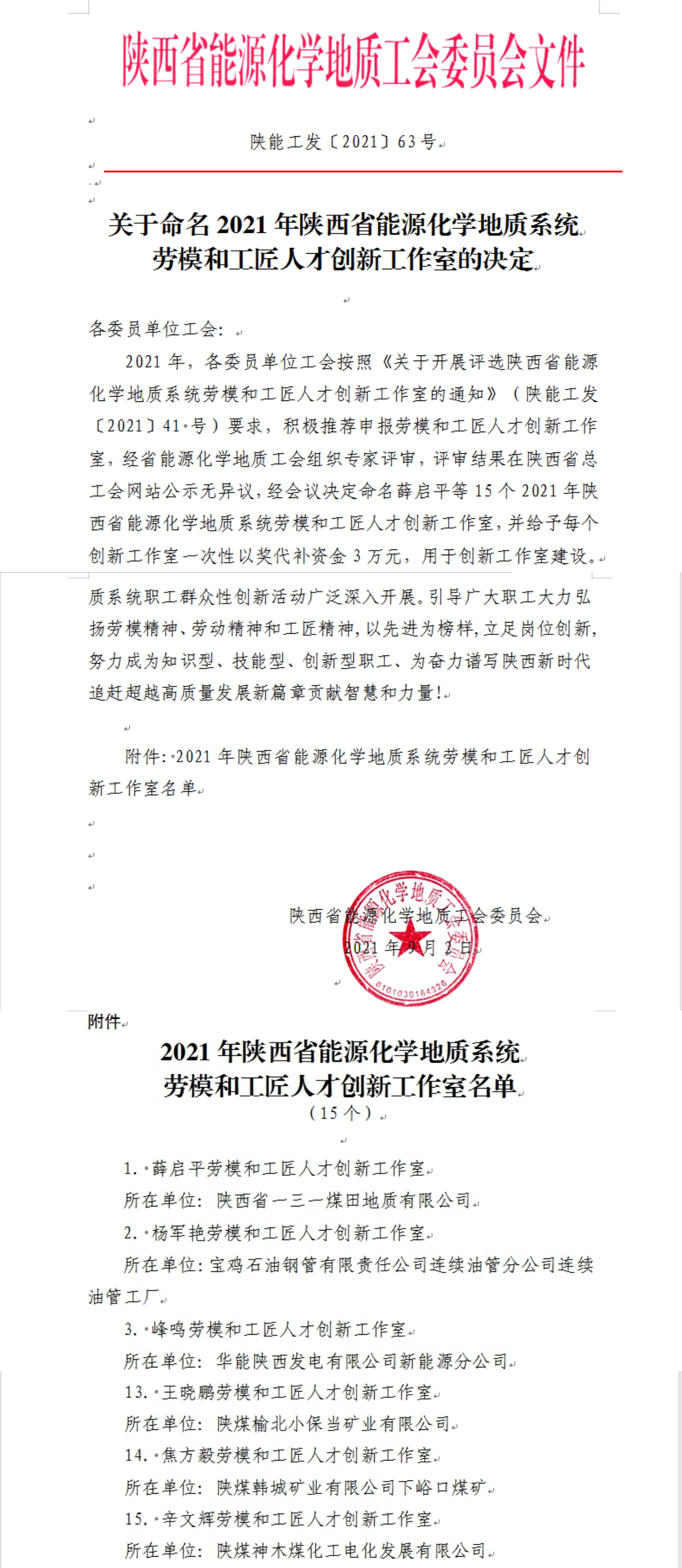 辛文輝勞模創(chuàng)新工作室被評為陜西省能源化學地質系統(tǒng)勞模和工匠人才創(chuàng)新工作室