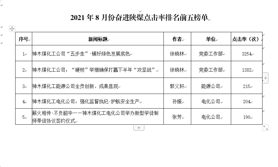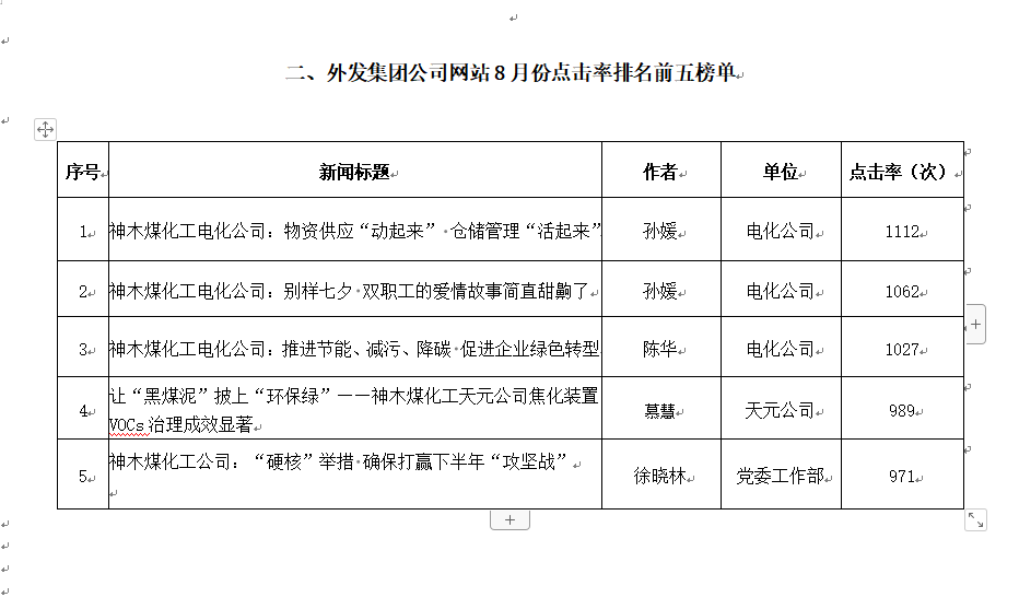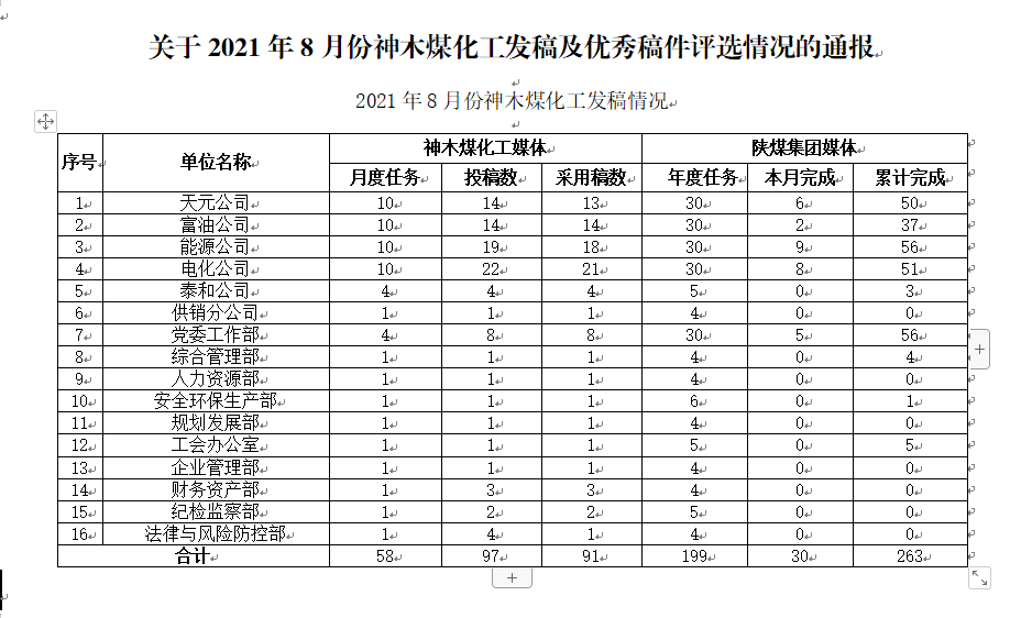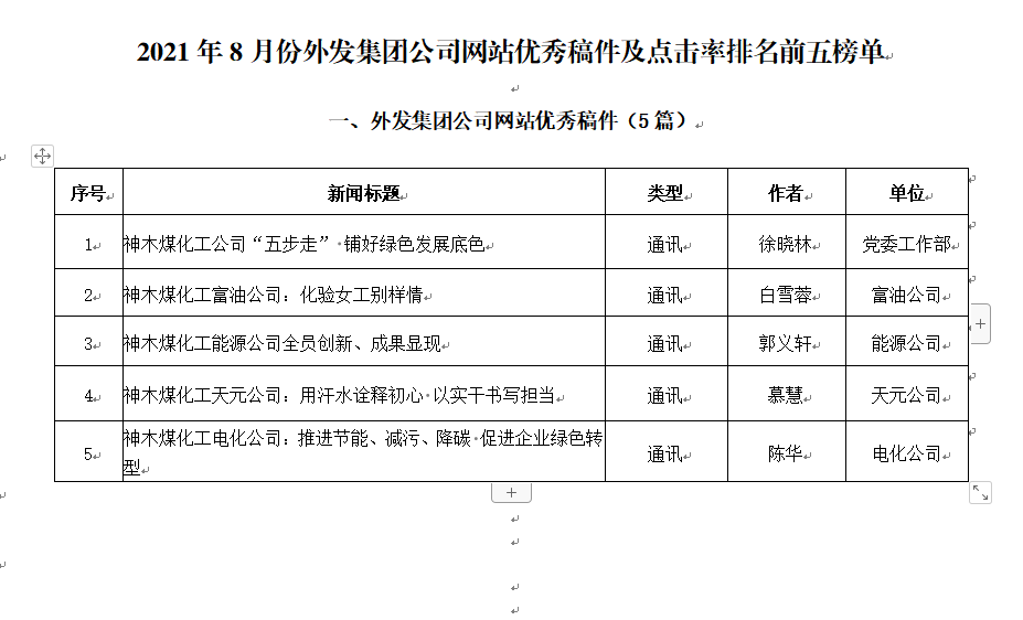 關于2021年8月份神木煤化工公司發稿及優秀稿件評選情況的通報