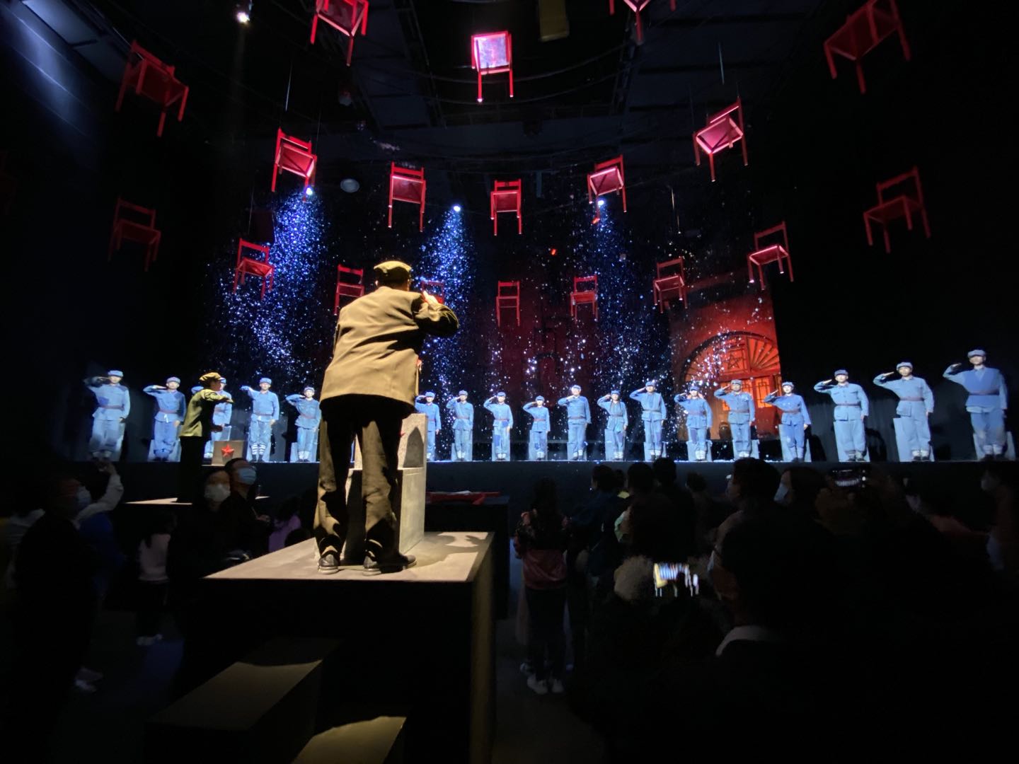 9月19日晚上7點,大家在延安紅街觀看了沉浸式情景劇《再回延安》。該劇為四幕劇,以一本老紅軍的日記為線索,講述了一個紅旗班的故事,采用典型的“小人物、大主題,小場景、大視覺”的表達手法,給觀眾展示了那一路走來的心酸不易和頑強堅定的意志。故事由日記的主人劉寶順之孫以第一人稱的視角講述。不同于以往“坐著看”,此次沉浸式的演出采用了行進式“走著看”,劇情會隨著故事的推移切換場景。演出在《歌唱祖國》的大合唱中落下帷幕。