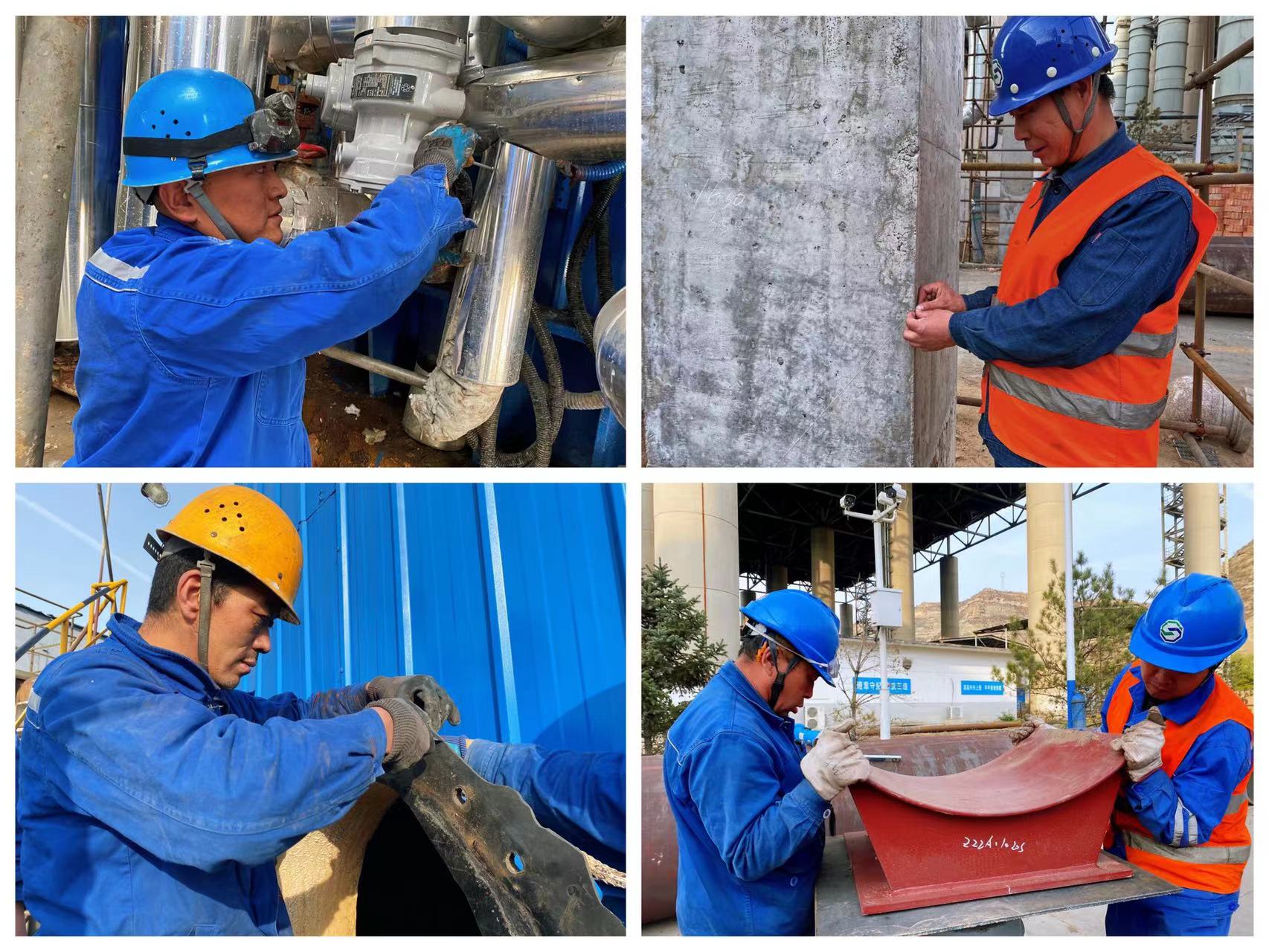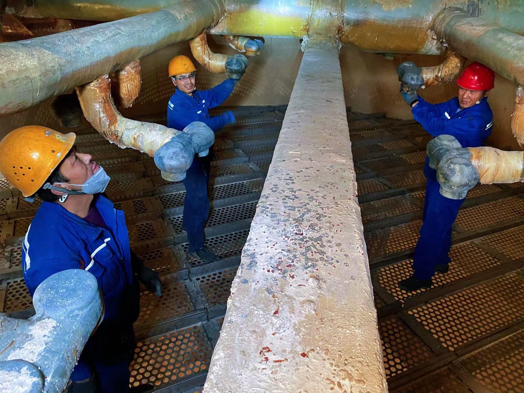 與此同時,本次檢修還以“降本增效”為依托,兩大分廠雙管齊下,不斷取得新突破。為了電石爐降低電耗,提高產(chǎn)量,電化公司利用此次檢修將5#電石爐殼進(jìn)行擴(kuò)容改造,把爐內(nèi)徑由9950mm擴(kuò)大至10200mm,對耐火磚爐墻重新進(jìn)行了砌筑,為的就是大修后達(dá)到降低爐殼表面溫度,杜絕出現(xiàn)爐墻發(fā)紅、冒火、燒穿等事故的效果。通過一次次審圖、試驗(yàn),想方設(shè)法克服擴(kuò)容后出爐平臺間隙間距狹窄、內(nèi)層材料砌筑質(zhì)量要求嚴(yán)格等一系列棘手問題。再看熱電分廠,濕煤泥系統(tǒng)的改造也是實(shí)現(xiàn)降本增效和解決固廢問題的關(guān)鍵所在。但是面對煤泥管道的疏通和爐頂開孔50余根讓管焊接的問題,電化公司副總經(jīng)理惠曉鵬帶領(lǐng)技術(shù)人員駐扎一線,提前一個月進(jìn)行煤泥輸送管道疏通確認(rèn),遇到問題就地開展現(xiàn)場會議討論方案。