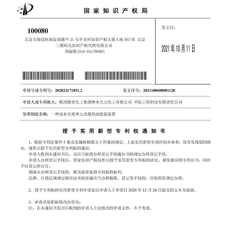 近日,神木煤化工天元公司申請(qǐng)的“一種油水分離單元及煤焦油脫氯裝置”實(shí)用新型專利獲得國(guó)家知識(shí)產(chǎn)權(quán)局授權(quán)。