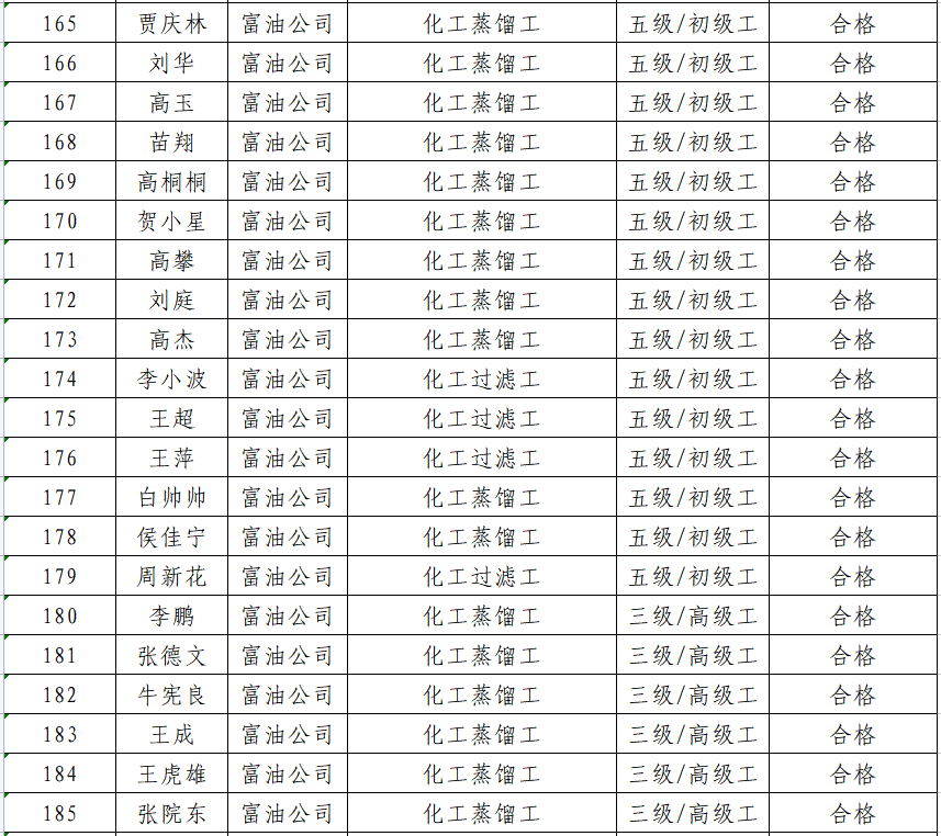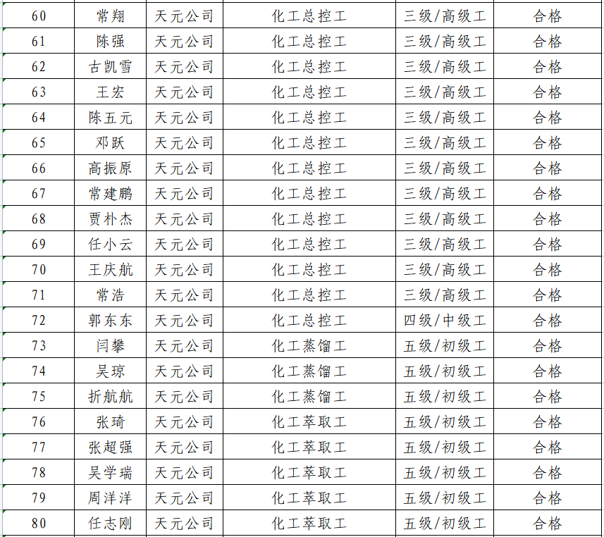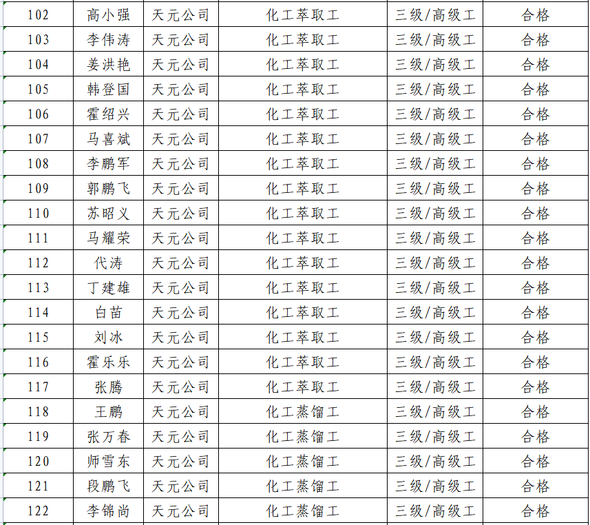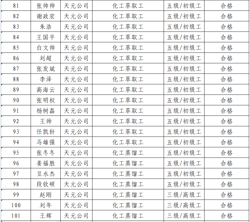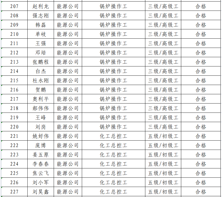 根據神木煤化工《關于開展2021年度職業技能等級認定工作的通知》(神煤化司發〔2021〕218號)文件安排,公司于10月21日至22日組織開展了2021年度初、中、高級職業技能等級認定考核,共366人參加,281人合格(其中:高級工159人,中級工1人,初級工121人)。現將擬通過人員名單進行公示: