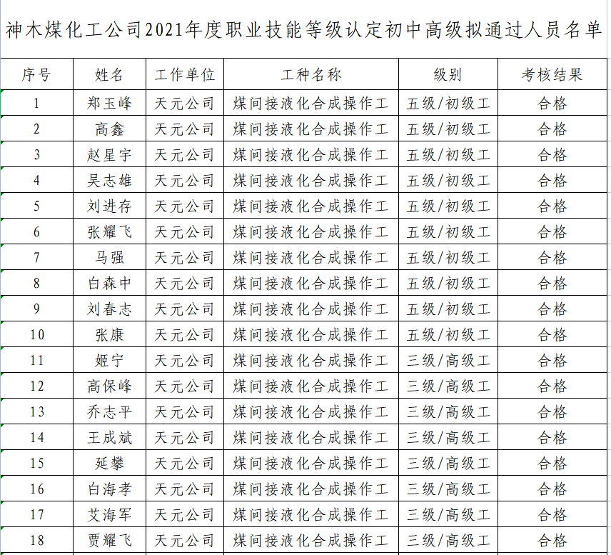 神木煤化工產業有限公司關于2021年度職業技能等級認定初中高級擬通過人員名單公示