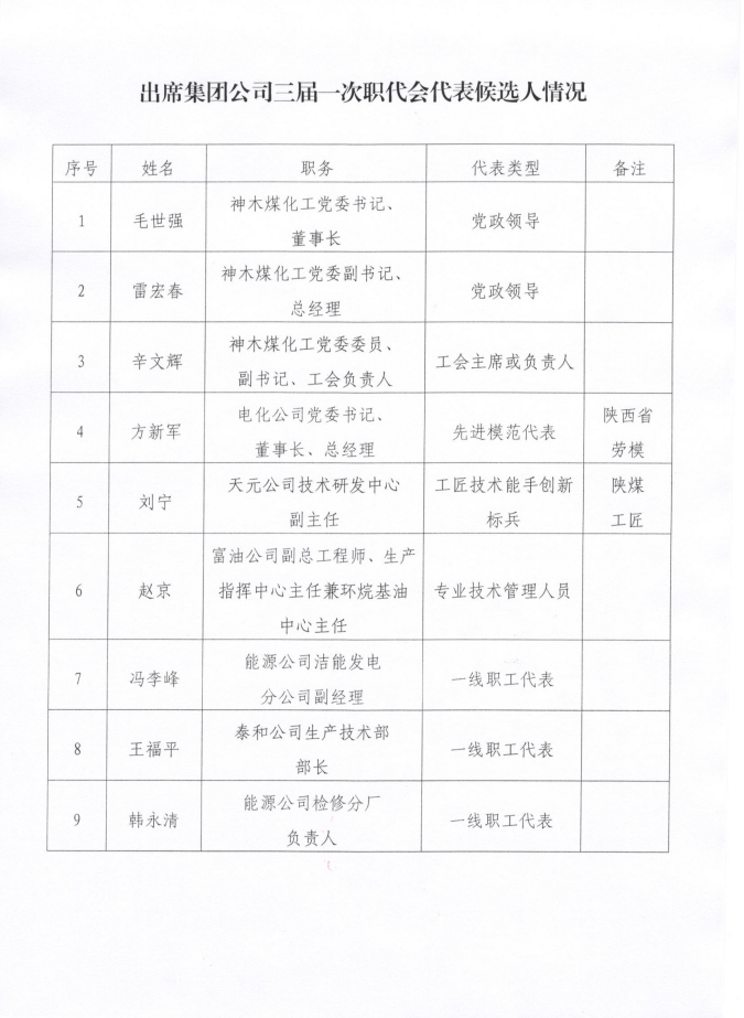 神木煤化工公司出席集團公司三屆一次職代會代表公示