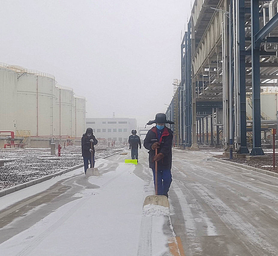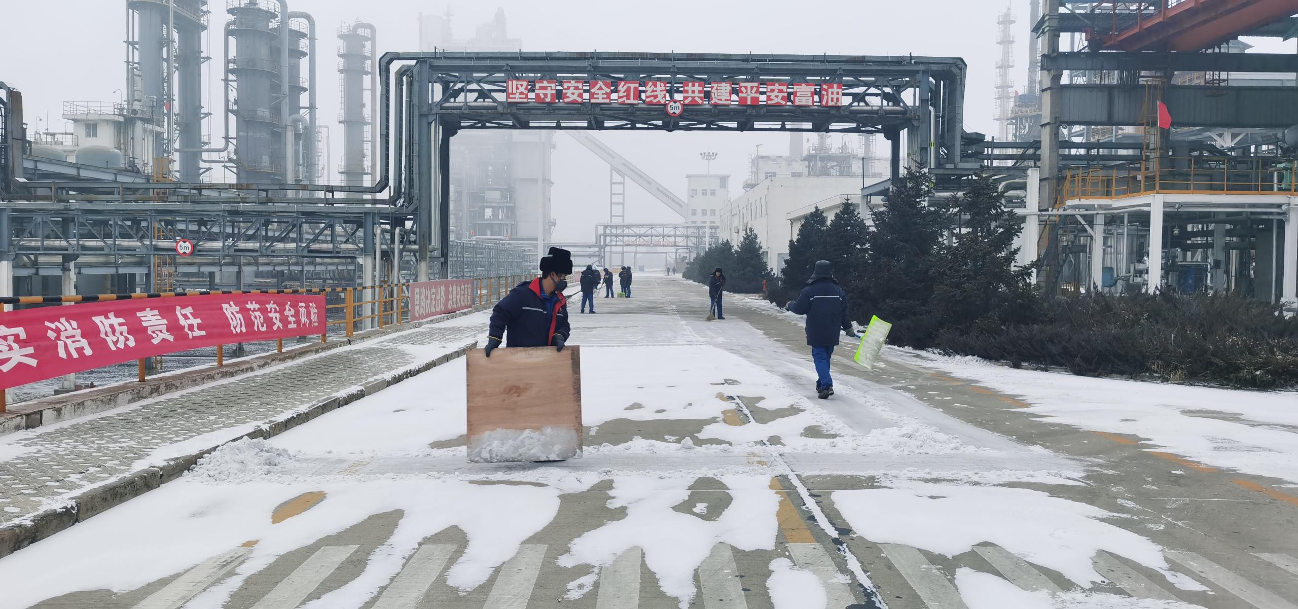 轉瞬間,廠內人潮涌動、響聲四起,大家在低溫中躬著身子頂著寒風, 握著掃帚、拿著鐵鍬,掃、鏟、推,干勁十足。喊聲、笑聲、掃雪聲、鏟冰聲匯成一首和諧美妙的進行曲。經過1個小時地激戰,廠區主干道露出了真容,雪后的廠區顯得格外清新潔凈,員工和車輛出行方便自如。