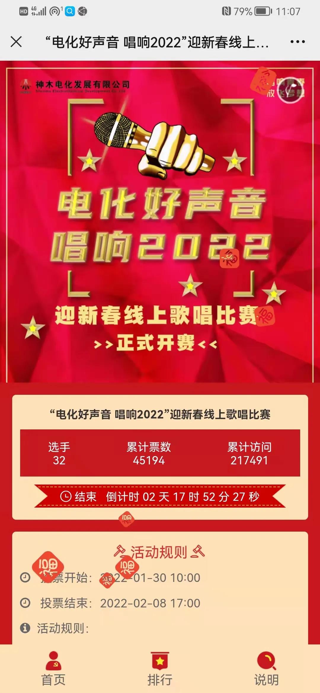 “才1個小時,訪問量已經1.8萬了!”除夕前一天早上10時,神木煤化工電化公司工會舉辦的“電化好聲音 唱響2022”迎新春線上歌唱比賽活動鏈接準時發出,同步開啟投票窗口,創新的活動形式,線上互動的參與方式,瞬間燃爆微信群、朋友圈。截至發稿前,總訪問量突破21萬,活動影響力不斷彰顯。
