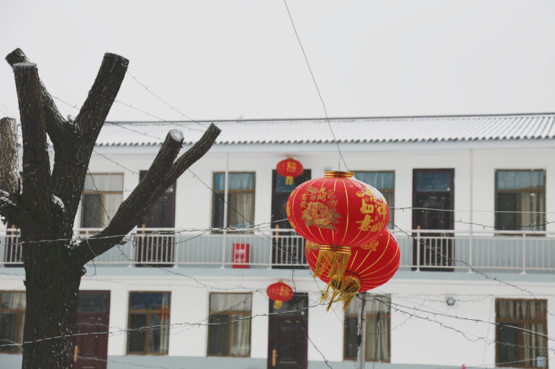 紅燈籠,白雪,藍墻,