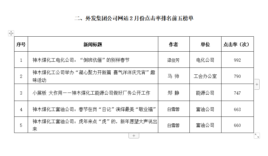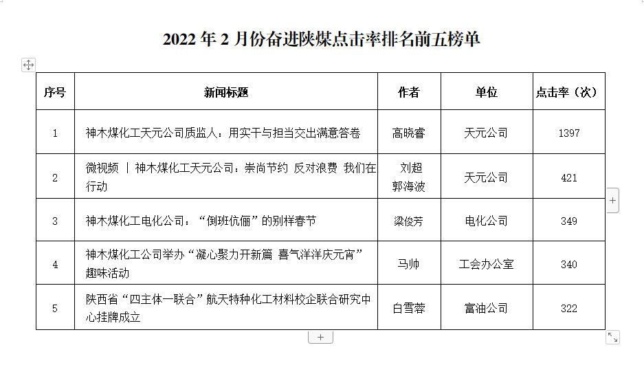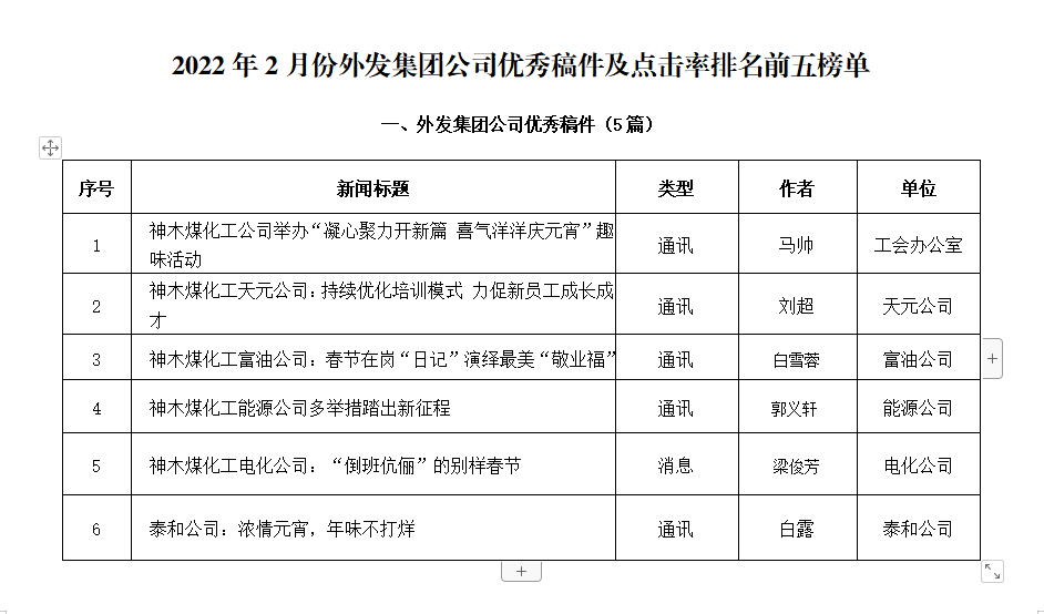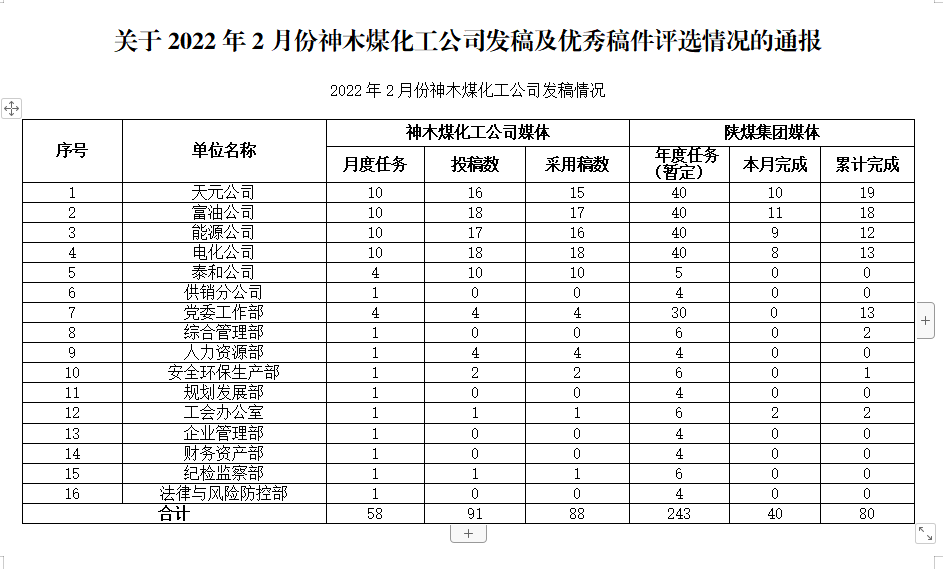 關于2022年2月份神木煤化工公司發稿及優秀稿件評選情況的通報