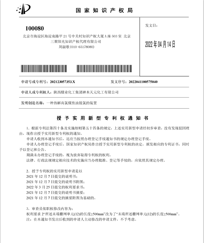 近日,神木煤化工天元公司申請的“一種熱解高氯煤焦油脫氯的裝置”和“一種旋風分離器”獲得國家知識產權局授權。