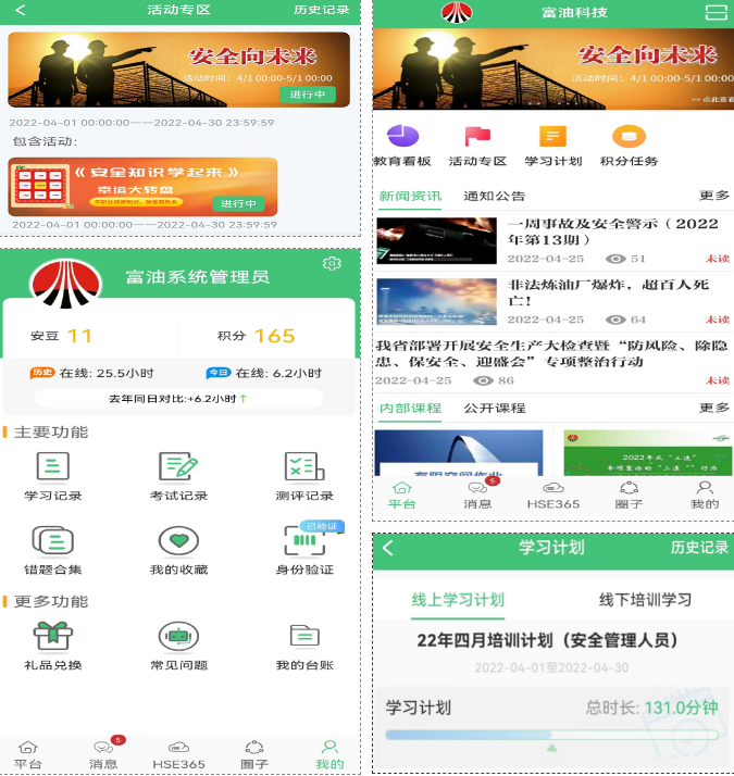 自應(yīng)急管理部發(fā)布《危險化學(xué)品企業(yè)安全培訓(xùn)空間建設(shè)應(yīng)用指南(試行)》等重要文件以來,富油公司堅決秉持《安全培訓(xùn)空間》“先合規(guī)再增強”建設(shè)思想,扎實推進(jìn)安全培訓(xùn)內(nèi)容規(guī)范化、方式多樣化、管理信息化、方法智能化和監(jiān)管日常化,實現(xiàn)系統(tǒng)性、趣味性、針對性的安全培訓(xùn),以提高人員安全素質(zhì)的要求。在連續(xù)應(yīng)用HSE365平臺3年后再次啟用新功能,建成了以安全文化“橫向覆蓋”為培訓(xùn)主線,以安全能力“縱向深入”為空間建設(shè)重點的線上線下融合的數(shù)字化安全培訓(xùn)空間,含有線上安全學(xué)習(xí)網(wǎng)絡(luò)空間、培訓(xùn)信息管理空間、多媒體教室的線下培訓(xùn)物理空間。